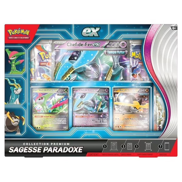 Etrange… Nous avons l'impression d'avoir déjà vu ces trois Pokémon ensemble. Dans cette Collection Premium, vous retrouverez les forces futuristes de Vert-de-Fer, de Chef-de-Fer et de Roc-de-Fer en tant que Pokémon-ex, ainsi qu'une version grand format de Chef-de-Fer-ex pour votre collection. Vous obtiendrez également 7 boosters du JCC Pokémon et un étui pour 3 cartes avec un support pour garder vos cartes préférées à l'abri.