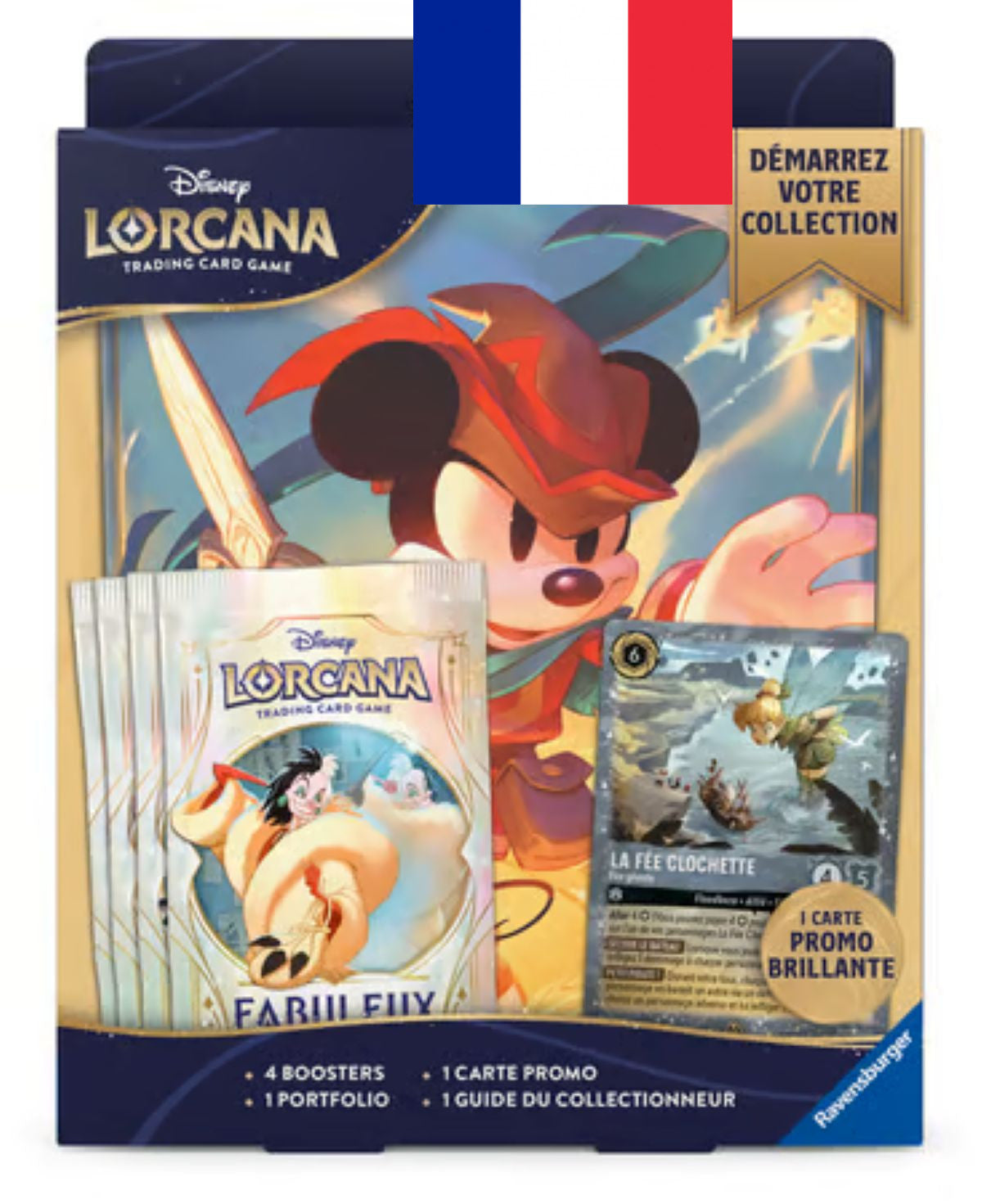 Ce coffret comprend 4 boosters Lorcana de 12 cartes chacun, une carte promo exclusive de la Fée Clochette en finition brillante pailletée, un portfolio A5 à l'effigie de Mickey dans le style Petit Tailleur pouvant accueillir jusqu'à 80 cartes, et un guide du collectionneur. Ce starter set est donc parfait pour tous ceux qui souhaitent se lancer dans l'aventure de Disney Lorcana !